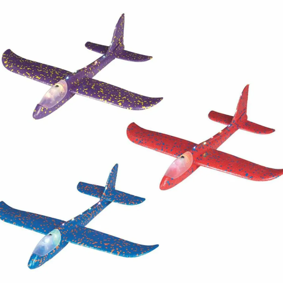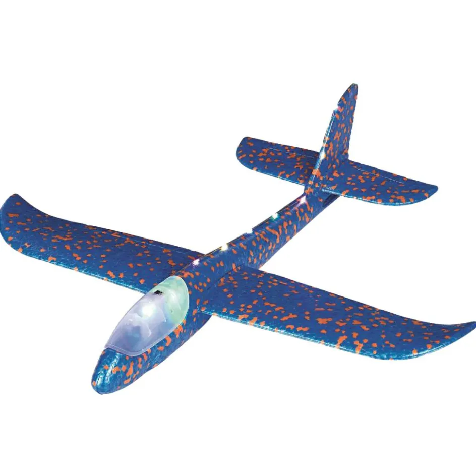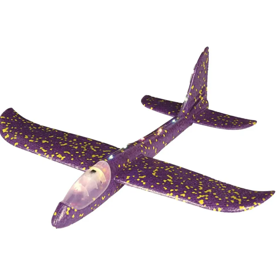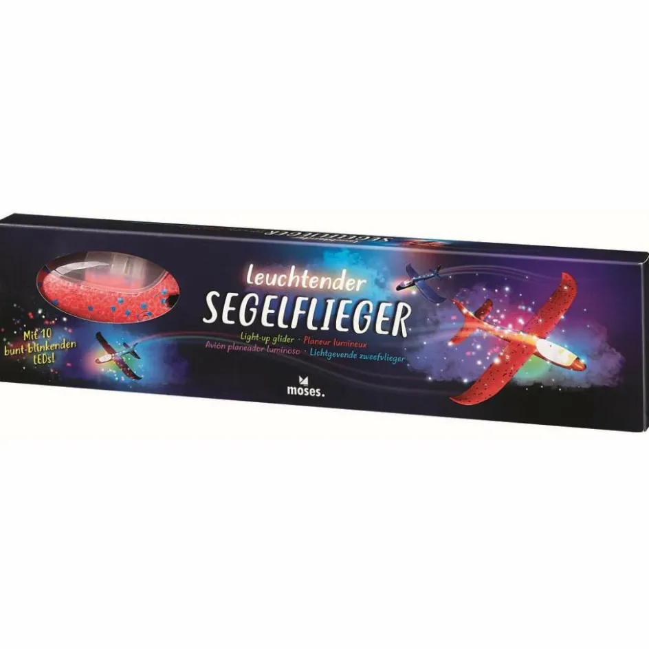Het Moses. Verlag Lichtgevende zweefvliegtuig van 47 cm heeft lampjes die kunnen knipperen of constant branden. U kunt dit vliegtuig laten zweven of loopings laten maken. Het zweefvliegtuig komt inclusief batterijen en is verkrijgbaar in drie kleurvariaties.