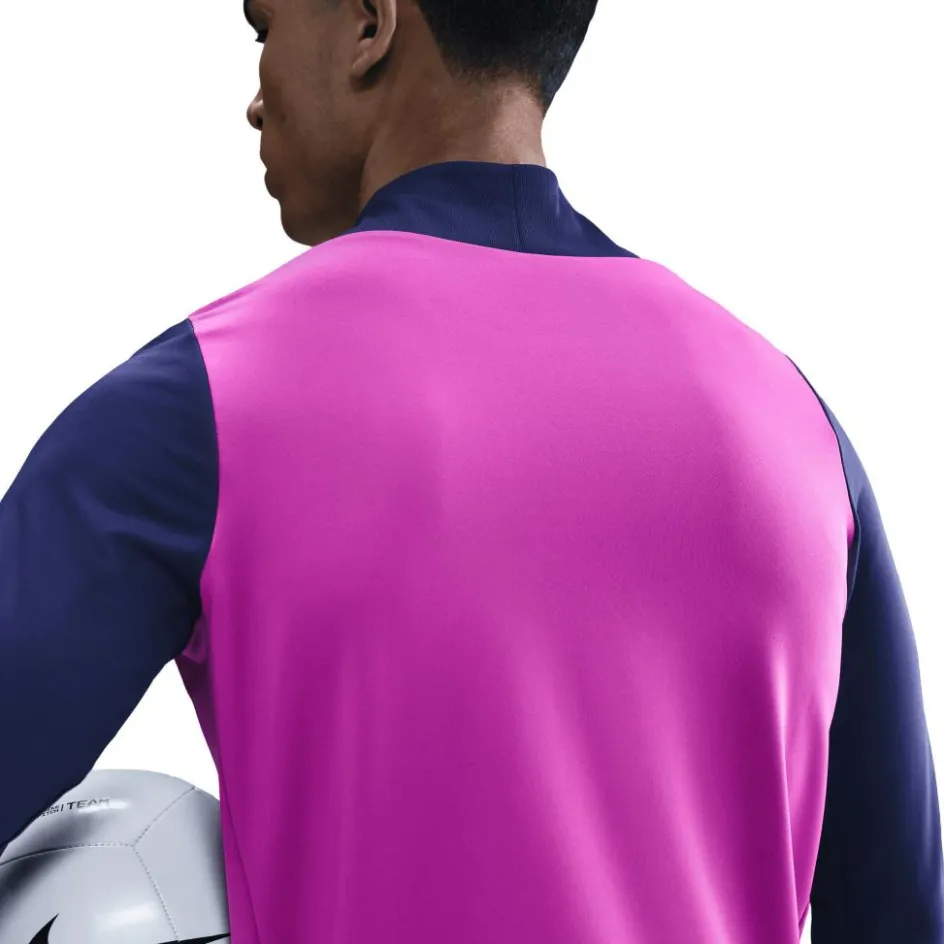 Het Nike FC Barcelona Strike trainingsshirt is ideaal voor op de koudere dagen, dankzij de lange mouwen en de hoge kraag die de wind uit uw nek houdt. Het sneldrogende materiaal voert transpiratievocht af, waardoor er meer focus en een fris gevoel wordt ervaren.