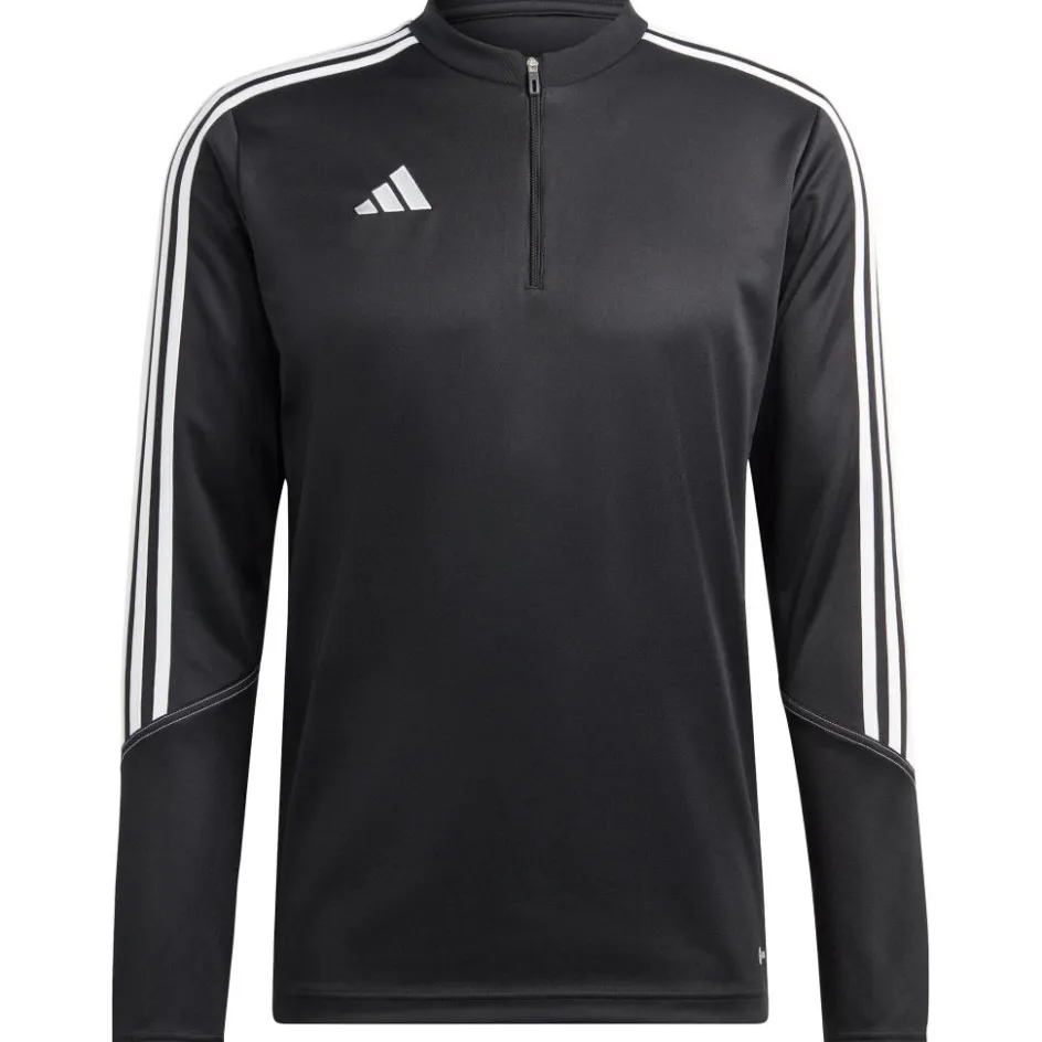 Het adidas Tiro 23 Club trainingsshirt voor heren heeft opvallende lijnen op de armen staan. De opstaande kraag heeft een rits en de trui houdt u goed warm tijdens de training. De stof droogt snel en voelt aangenaam op de huid.