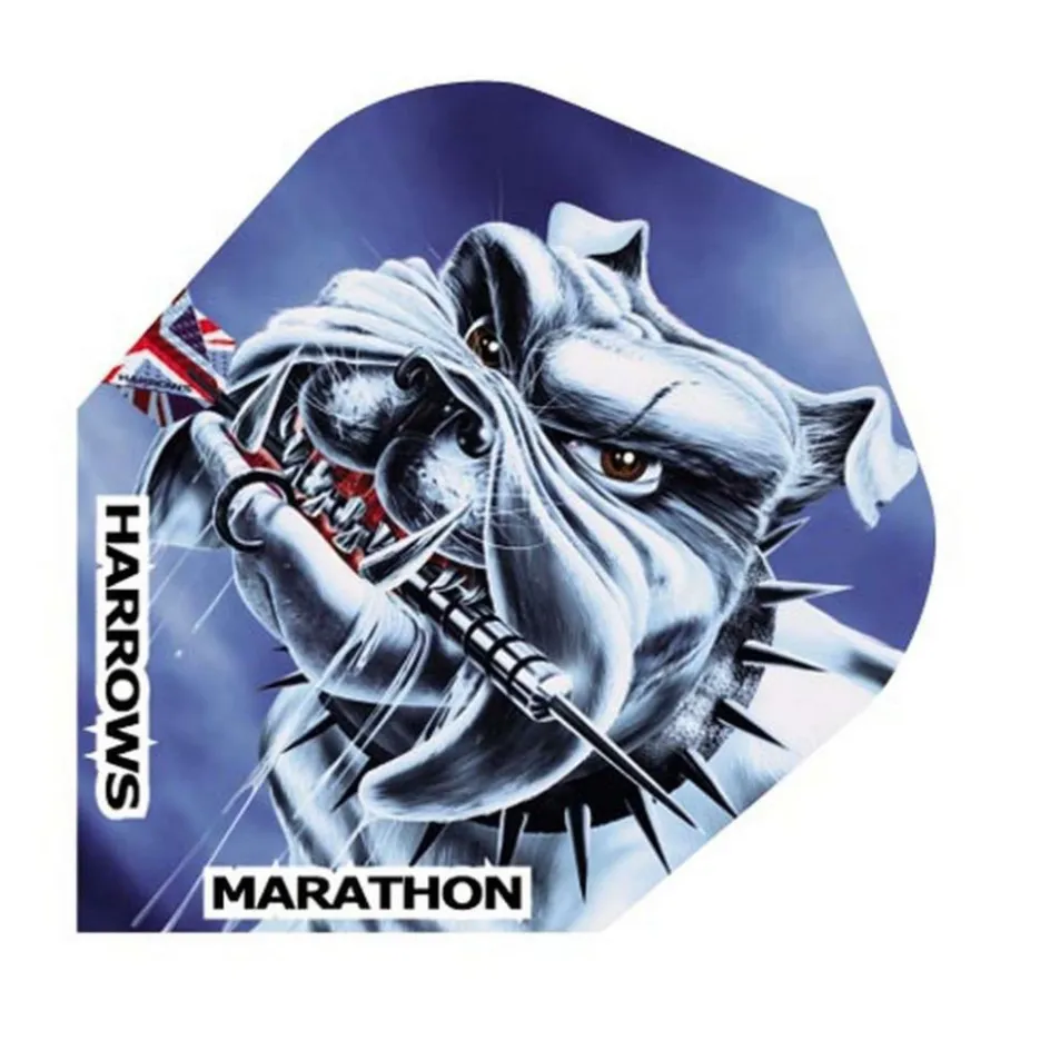 De Harrows Darts Marathon Bulldog flights is een set van drie extra dikke dartflights. De Harrows Darts flights hebben een opdruk van een bulldog met een dartpijl in zijn bek.