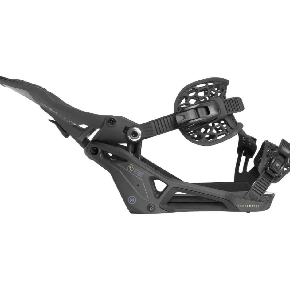 De Nidecker Supermatic bindingen zijn de eerste automatische bindingen die met elke schoenen compatibel zijn. Dankzij het intuïtieve ontwerp kunt u eenvoudig je voeten door de achterkant schuiven en op het hielpedaal trappen om de hiback automatisch omhoog te laten klappen. Een handige ontgrendelingshendel maakt het uitstappen net zo snel en eenvoudig. De Supermatic biedt de rijervaring van een klassieke tweebandsbinding, waarbij de ratels indien nodig handmatig kunnen worden bediend. De bindingen zijn gemaakt van betrouwbare materialen zoals een glasvezelnylon basisplaat, wat zorgt voor duurzaamheid en comfort. De AuxTech-banden zorgen voor een perfecte pasvorm rond de schoenen.