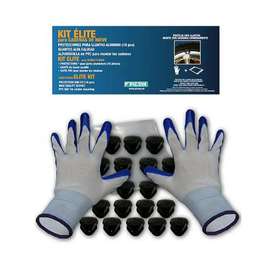 De PICOYA Sneeuwkettingen beschermingsset kunt u gebruiken om de velgen van uw wielen te beschermen bij het bevestigen van sneeuwkettingen. Deze beschermingsset van PICOYA bestaat uit 18 velgbeschermers van kunststof, twee montagehandschoenen en een PVC mat waar u alle onderdelen op kunt leggen tijdens het monteren.