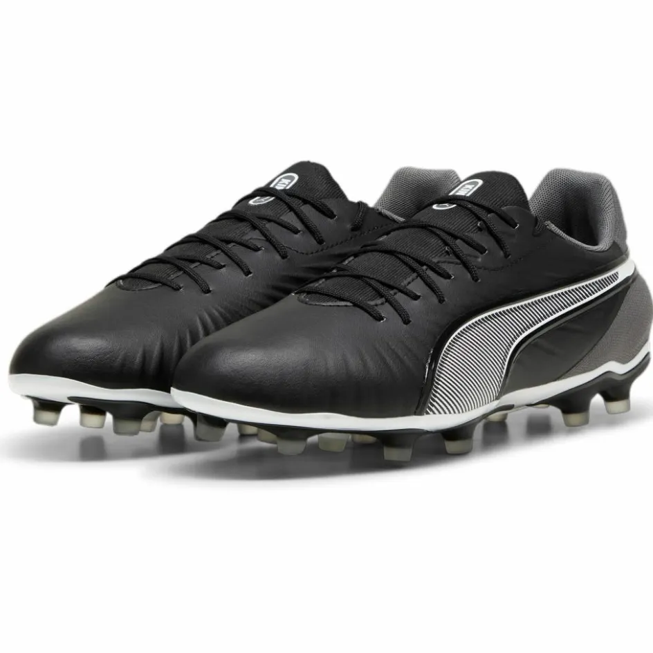 De PUMA KING MATCH FG AG voetbalschoenen voor heren hebben een laag uitgesneden instapmodel met een lichtgewicht bovenwerk die zacht aansluit rondom de voeten. De buitenzool is gemaakt van TPU met conische noppen die voor uitstekende grip zorgen op vaste als kunstmatige ondergronden.
