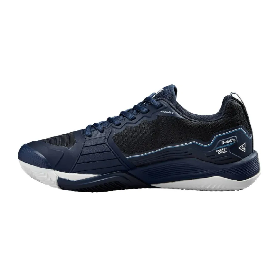 De voortstuwingsplaat onder de voet, in combinatie met het 4D-steunchassis, biedt de nodige stabiliteit voor snelle bewegingen op de baan en voegt extra energie toe aan elke stap. De tussenzool, gemaakt van Energy Cell-schuim en R-DST+, levert uitstekende demping en een soepele, zachte tred.